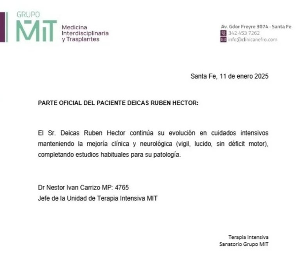 "El Sr. Deicas Rubén Héctor continúa su evolución en cuidados intensivos manteniendo la mejoría clínica y neurológica (vigil, lúcido, sin déficit motor), completando estudios habituales para su patología", reza el texto, firmado por el Dr. Néstor Iván Carrizo, jefe de la Unidad de Terapia Intensiva MIT.