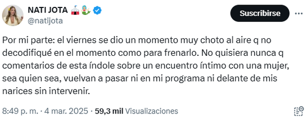 Mientras tanto, en respuesta a las críticas que recibió por no frenar los dichos de su compañero en vivo, Nati Jota expresó su arrepentimiento en redes sociales: “Por mi parte: el viernes se dio un momento muy choto al aire que no decodifiqué en el momento como para frenarlo. No quisiera nunca que comentarios de esta índole sobre un encuentro íntimo con una mujer, sea quien sea, vuelvan a pasar ni en mi programa ni delante de mis narices sin intervenir”, reconoció.