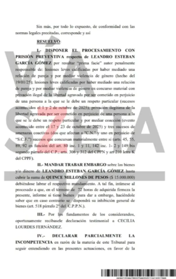 II.- MANDAR TRABAR EMBARGO y/o dinero de sobre los bienes LEANDRO ESTEBAN GARCÍA GÓMEZ cubrir la suma de QUINCE MILLONES DE PESOS ($ 15.000.000).