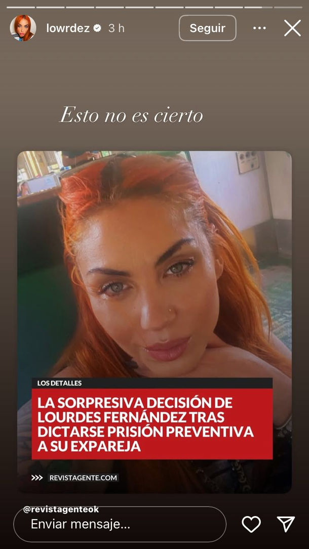 La información proveniente del periodista Mauro Szeta -que posteriormente fue negada por Lourdes- tuvo especial trascendencia luego de que le dictarán prisión preventiva al acusado. Sin embargo, la artista escribió: "Esto no es cierto", en sus historias de Instagram, para echar por tierra las versiones de que jugaría un rol fundamental en el proceso contra su exnovio.