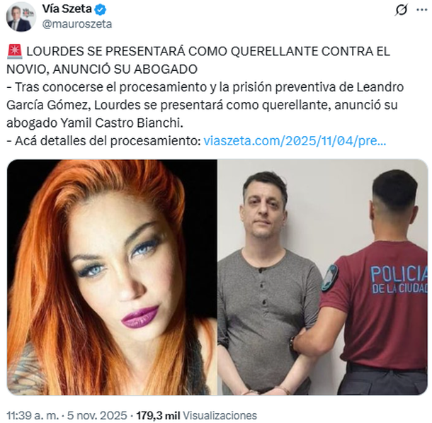 Si bien, en un primer momento, la artista defendió al acusado, su abogado Yamil Castro Bianchi informó que ahora Lourdes ha decidido pararse en la vereda opuesta a su exnovio y será quien también impulse el proceso en su contra. Cabe señalar que ella ya lo había denunciado por violencia de género en 2022, algo que después echó para atrás.