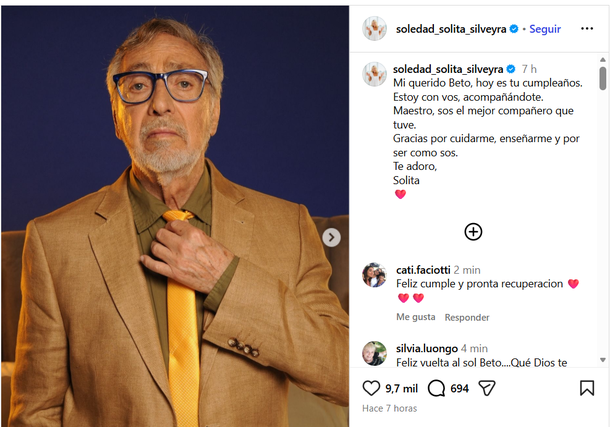 A ese gesto se sumó también Soledad Silveyra, que eligió dedicarle un mensaje profundamente personal: “Mi querido Beto, hoy es tu cumpleaños. Estoy con vos, acompañándote. Maestro, sos el mejor compañero que tuve. Gracias por cuidarme, enseñarme y por ser como sos. Te adoro, Solita”.