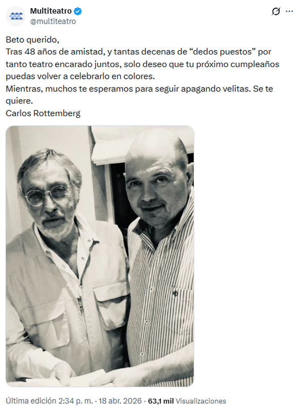 Entre los mensajes que más repercusión generaron estuvo el de Carlos Rottemberg, quien recurrió a la red social X para saludarlo con palabras atravesadas por una larga historia compartida: “Beto querido, tras 48 años de amistad, y tantas decenas de ‘dedos puestos’ por tanto teatro encarado juntos, solo deseo que tu próximo cumpleaños puedas volver a celebrarlo en colores. Mientras, muchos te esperamos para seguir apagando velitas. Se te quiere”.