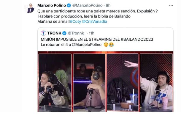"Hablaré con producción, leeré la Biblia de Bailando. ¡Mañana se arma! #Coty @CrisVanadia", agregó Polino como advertencia.