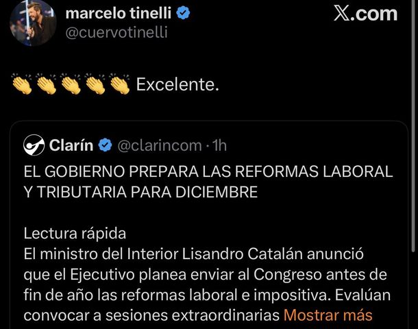 "Excelente", festejó Marcelo Tinelli entre emojis de aplausos en su perfil de X, donde este miércoles llamó la atención de sus seguidores al citar un artículo periodístico sobre el tema de la reforma laboral.