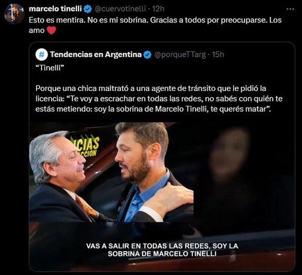 "A ver, mostrame la licencia. Falta la parte de atrás", afirmó la agente. "¿Qué parte de atrás? Esta es la aplicación. Vas a salir en todas las redes. Soy la sobrina de Marcelo Tinelli. Así te lo digo, vas a salir en todas las redes", exclamó. Fue debido a este insólito momento que involucra su nombre que Tinelli se vio obligado a hablar y desmentir su parentesco con la chica que protagoniza el clip: "Esto es mentira. No es mi sobrina. Gracias a todos por preocuparse. Los amo", aclaró sin tapujos.