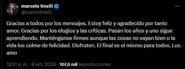 Por otro lado, en otro posteo a través de la red social X, Tinelli agradeció el apoyo y sentenció: "Gracias a todos por los mensajes. Estoy feliz y agradecido por tanto amor. Gracias por los elogios y las críticas. Pasan los años y uno sigue aprendiendo. Manténganse firmes aunque las cosas no vayan bien o la vida los colme de felicidad. Disfruten. El final es el mismo para todos. Los amo".