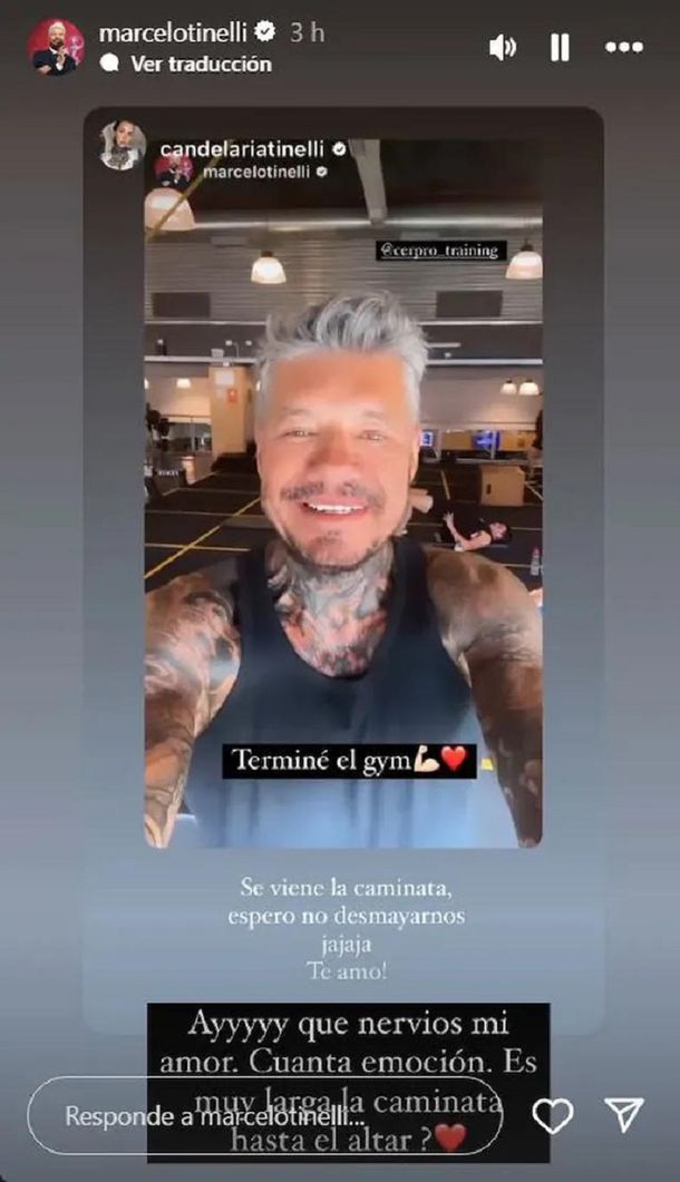 Al ver la historia, Lele se conmovió con lo dicho por su papá: “Se viene la caminata al altar, espero no desmayarnos jajaja. ¡Te amo!”, escribió. Y Tinelli agregó: “Ay, qué nervios, mi amor. Cuánta emoción. ¿Es muy larga la caminata hasta el altar?”.