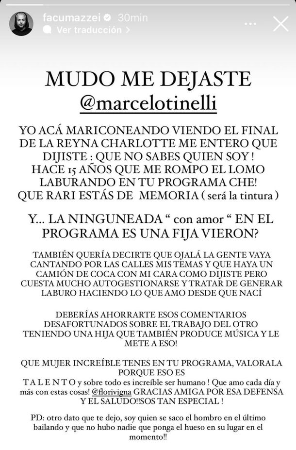 Marcelo Tinelli el martes ninguneó a Facundo Mazzei frente a su ex compañera y amiga Flor Vigna e inmediatamente, el bailarín le salió al cruce en sus redes.