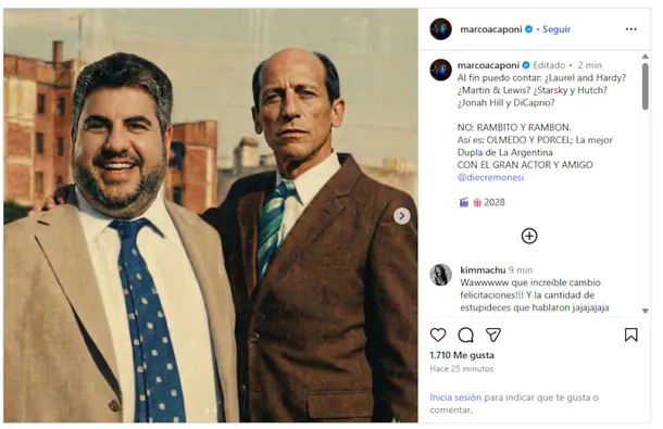 En la publicación que funcionó como revelación pública, Caponi aprovechó el revuelo para ironizar sobre los nombres que los usuarios habían puesto sobre la mesa: enumeró a “Laurel and Hardy”, “Martin & Lewis”, “Starsky y Hutch” y hasta “John Hill y DiCaprio”, para rematar, a modo de punchline, con la verdadera respuesta: “NO; RAMBITO Y RAMBÓN. Así es: OLMEDO Y PORCEL. La mejor dupla de la Argentina CON EL GRAN ACTOR Y AMIGO @diecermonesi”.