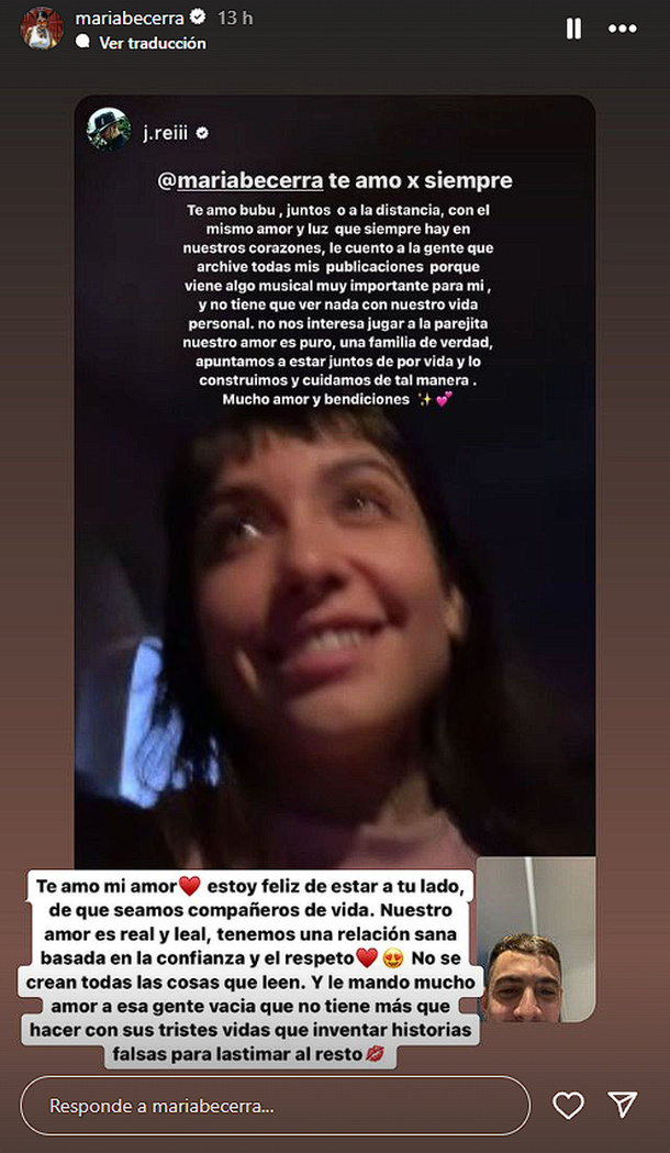 “Te amo, bubu, juntos o a la distancia, con el mismo amor y luz que siempre hay en nuestros corazones. Le cuento a la gente que archivé todas mis publicaciones porque viene algo musical muy importante para mí, y no tiene que ver con nuestra vida personal. No nos interesa jugar a la parejita, nuestro amor es puro, una familia de verdad”, manifestó el cantante.