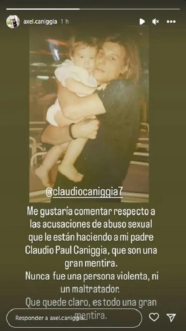 “Me gustaría comentar respecto a las acusaciones de abuso sexual que le están haciendo a mi padre, Claudio Paul Caniggia, que son una gran mentira. Nunca fue una persona violenta ni un maltratador. Que quede claro, es todo una gran mentira" escribió en una historia de Instagram junto a una foto a upa de su papá.