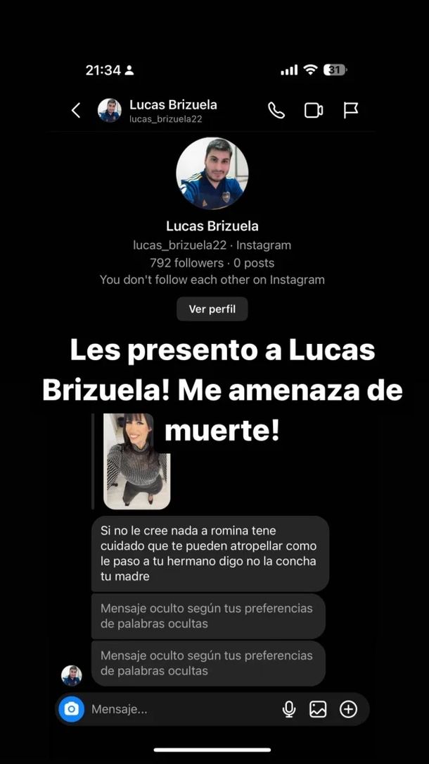 “Si no le creés nada a Romina, tené cuidado que te pueden atropellar como le pasó a tu hermano”, fueron las amedrentables palabras del usuario de la red social en cuestión, quien justificó su accionar: "Me caías bien y te cagaste con atacar a Romina, pelotud*".