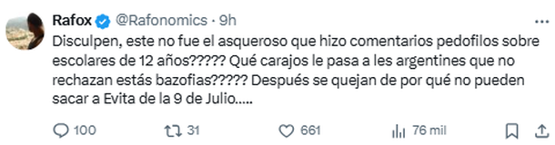 Finalmente, entre muchos otros tantos comentarios, alguien preguntó: "Disculpen, ¿este no fue el asqueroso que hizo comentarios pedófilos sobre escolares de 12 años? ¿Qué carajos le pasa a les argentines que no rechazan estás bazofias? Después se quejan de por qué no pueden sacar a Evita de la 9 de Julio", señaló polémico.