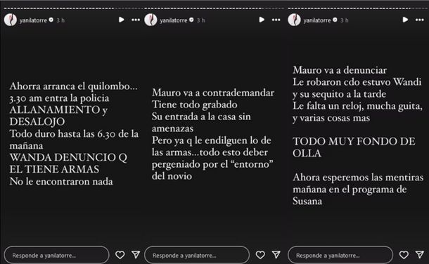 La periodista Yanina Latorre dio detalles del incidente a través de sus redes sociales. “Mauro va a contrademandar. Tiene todo grabado: su entrada a la casa sin amenazas”, afirmó. Además, señaló que el jugador está furioso por la acusación de armas y cree que el episodio fue orquestado por el entorno de Wanda, mencionando al cantante L-Gante.