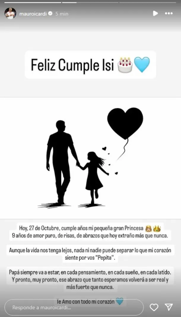 A través de sus historias de Instagram, Icardi compartió sus sentimientos: “¡Feliz cumple Isi!... 9 años de amor puro, de risas, de abrazos que hoy extraño más que nunca. Aunque la vida nos tenga lejos, nada ni nadie puede separar lo que siento por vos ‘Pepita’. Papá siempre va a estar, en cada pensamiento, en cada sueño, en cada latido. Y pronto, muy pronto, ese abrazo que tanto esperamos volverá a ser real y más fuerte que nunca. Te amo con todo mi corazón”. El contundente mensaje, acompañado de dibujos de un padre y su hija tomados de la mano, reflejó la añoranza del delantero, quien lleva meses sin ver a la pequeña.