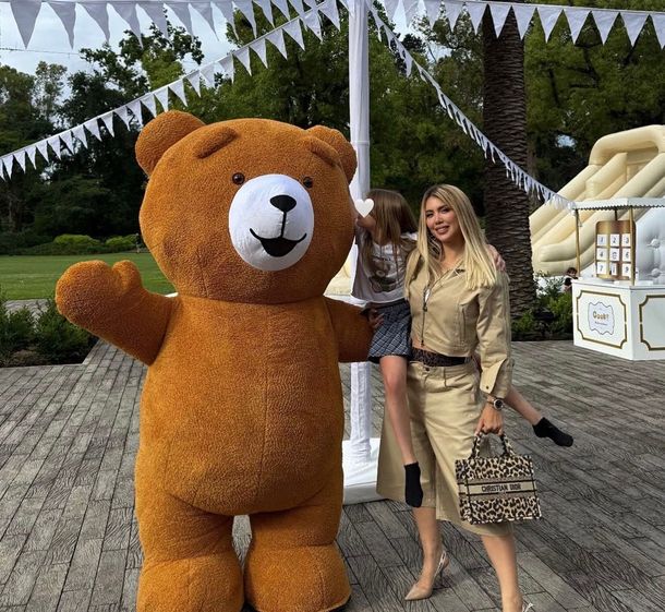 La primera celebración, en Buenos Aires, reunió a amigos y familiares, contando con la sorpresiva presencia de la familia de Icardi desde Rosario. La ambientación giró en torno a la ternura de los osos, con peluches gigantes, animadores disfrazados, credenciales personalizadas y una decoración meticulosamente pensada. La torta, de varios pisos en tonos suaves, llevaba la inscripción “Isabella” en dorado, y los invitados disfrutaron de juegos, inflables y hasta un “mini bear store” para canjear premios.