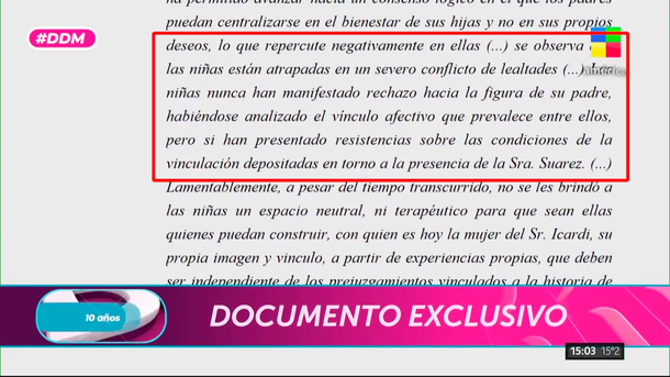 El informe también detalla la postura de las niñas respecto a su padre y el entorno de su madre. "Las niñas nunca han manifestado rechazo hacia la figura de su padre, habiéndose analizado el vínculo afectivo que prevalece entre ellos, pero sí han presentado resistencias sobre las condiciones de la vinculación depositadas en torno a la presencia de la señora Suárez", continuó el texto, leído en DDM. Este fragmento es clave, ya que, si bien las niñas mantienen un vínculo afectivo con Icardi, la presencia de Eugenia "la China" Suárez parece generarles resistencia.