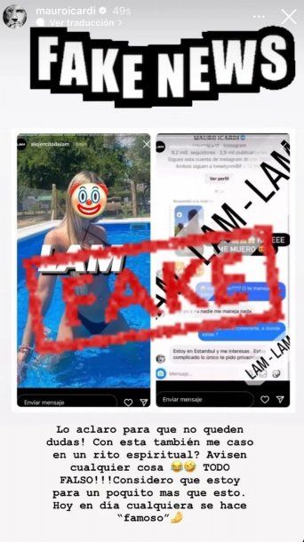 "¡Lo aclaro para que quedan dudas! ¿Con esta también me caso en rito espiritual? Avisen cualquier cosa...(emojis de risas) TODO FALSO!!! Considero que estoy para un poquito más que esto. Hoy en día cualquiera se hace 'famoso' (emoji de una mano haciendo montoncito)", posteó enojado Mauro.