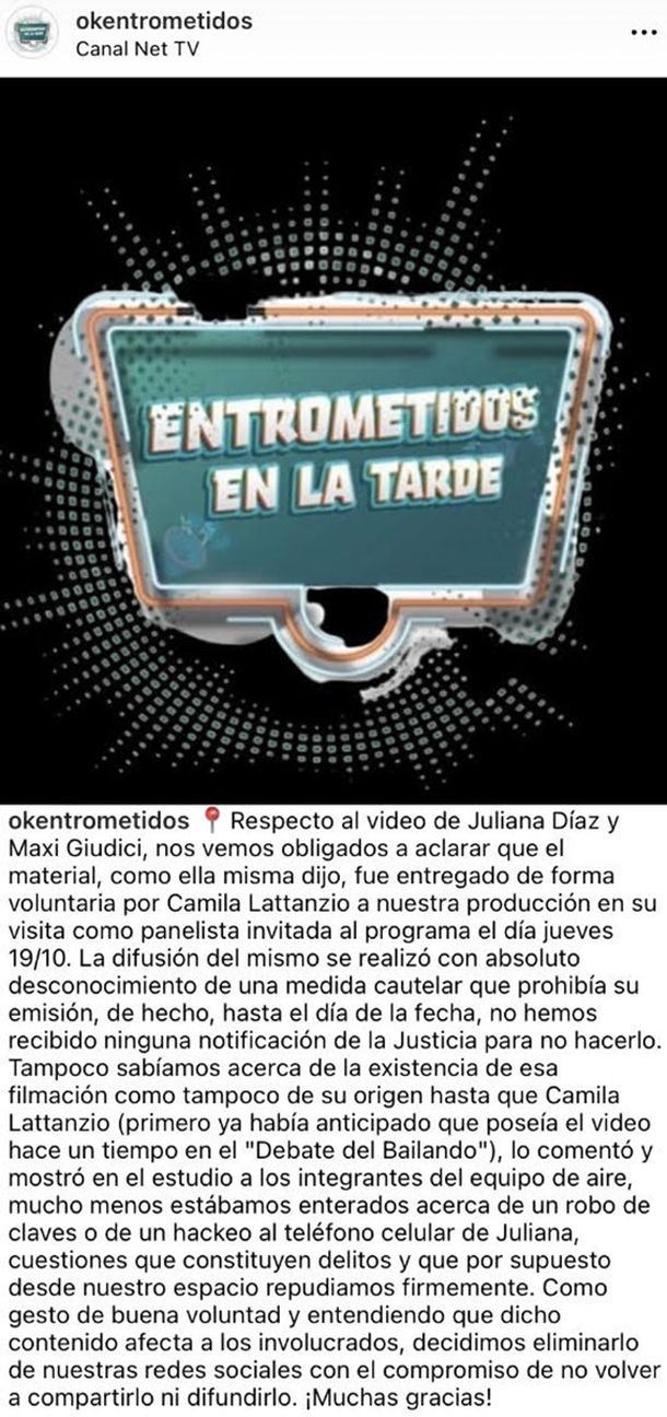 Para concluir, la producción del programa señaló: "Como gesto de buena voluntad y entendiendo que dicho contenido afecta a los involucrados, decidimos eliminarlo de nuestras redes sociales con el compromiso de no volver a compartirlo ni difundirlo".