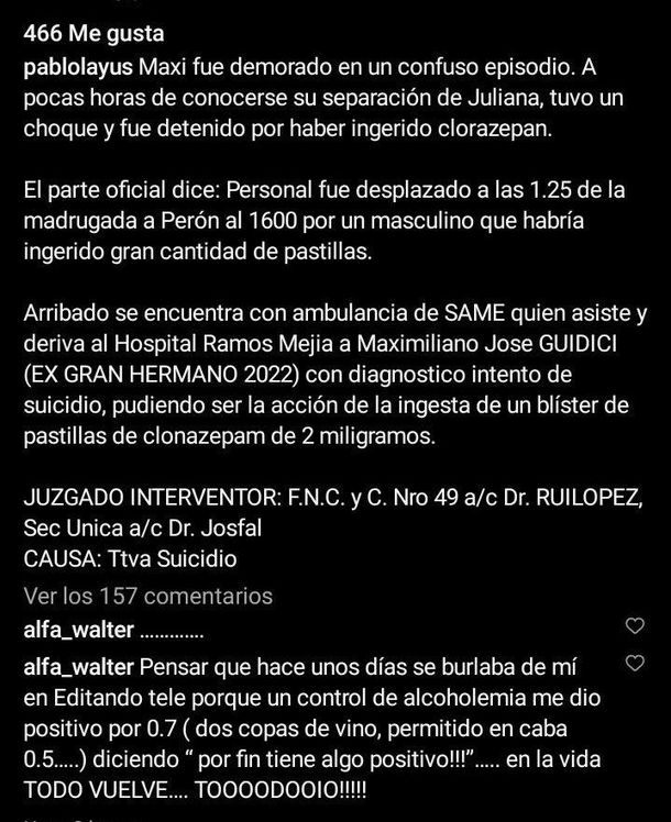 En torno a este difícil momento que atraviesa Giudici, Alfa -excompañero del cordobés en Gran Hermano- lanzó polémicas declaraciones que fueron repudiadas en redes sociales: "Pensar que hace unos días se burlaba de mí en Editando Tele porque un control de alcoholemia me dio positivo por 0,7 diciendo "¡por fin tiene algo positivo!". En la vida todo vuelve, todo", escribió el sexagenario en una publicación de Pablo Layus.