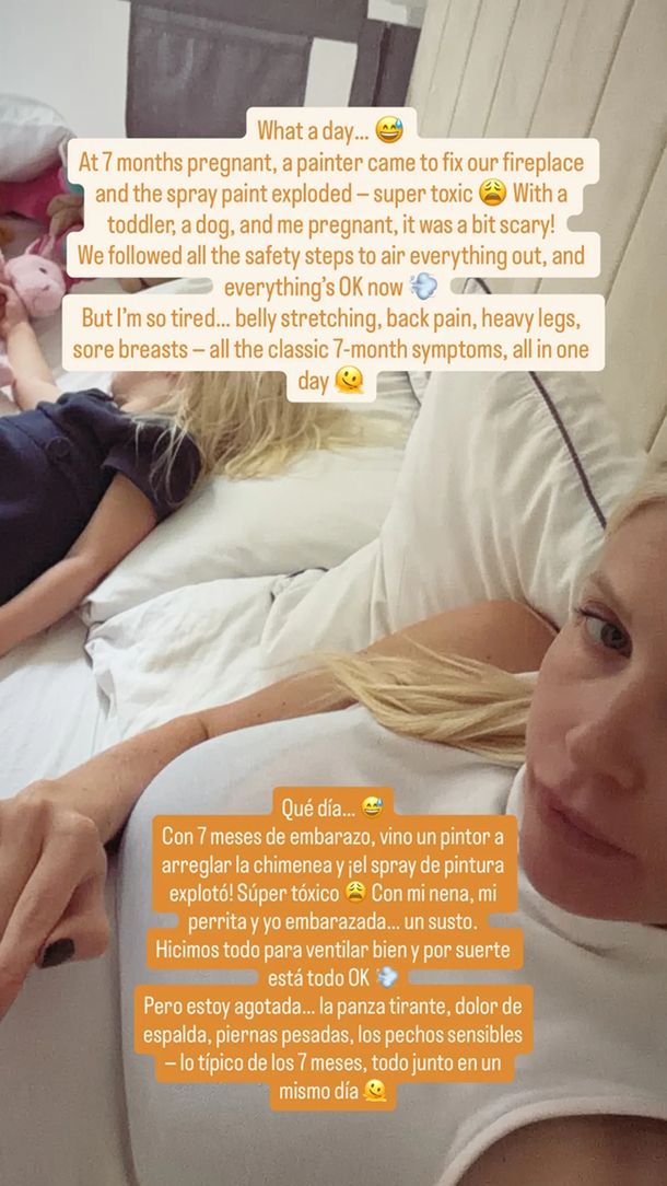 “Qué día... Con siete meses de embarazo, vino un pintor a arreglar la chimenea y el spray de pintura explotó. Supertóxico. Con mi nena, mi perrita y yo embarazada... un susto”, escribió Daniela, acompañando el mensaje con una selfie.