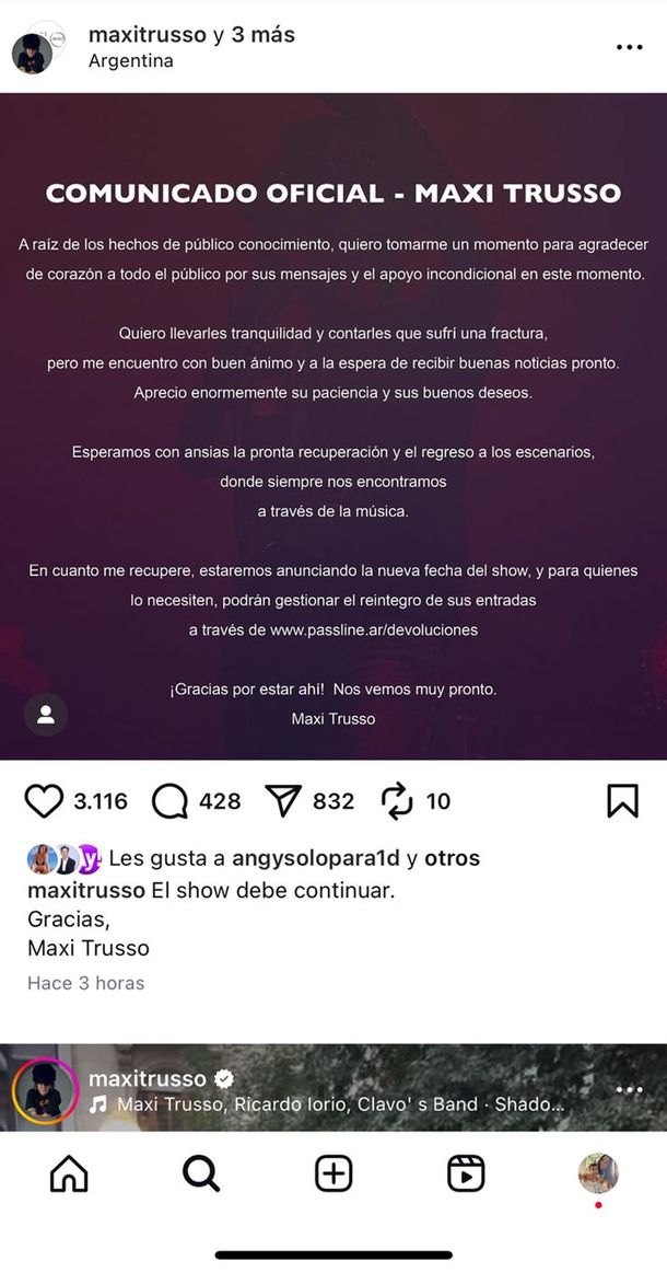 “En cuanto me recupere, estaremos anunciando la nueva fecha del show, y para quienes lo necesiten, podrán gestionar el reintegro de sus entradas a través de Passline”, agregó Y cerró el comunicado con su firma y un mensaje de esperanza: “¡Gracias por estar ahí! Nos vemos muy pronto". En la publicación en su cuenta de Instagram, escribió la reconocida frase: “El show debe continuar”.