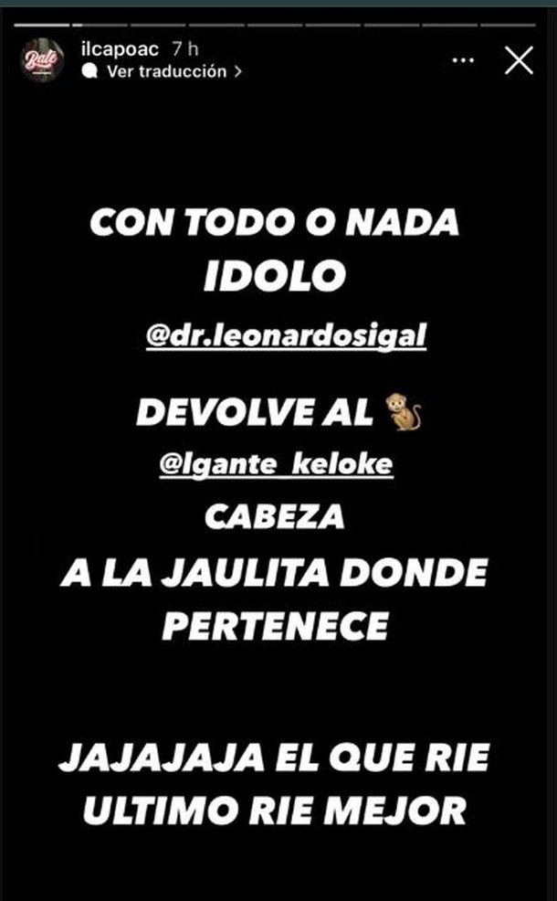 Con una historia escrita, destacó: "Con todo o nada ídolo @dr.leonardosigal. Devolvé al mono cabeza a la jaulita donde pertenece". Luego, cerró: “El que rie último, rie mejor”. Aunque, esto no fue todo, sino que en su historia siguiente lanzó con odio: “Quiero que devuelvas a ese primate tras las rejas, 8 años, devolvelo donde se merece, ahí dentro, encerrado. Yo igual le llevo unas bananitas...".