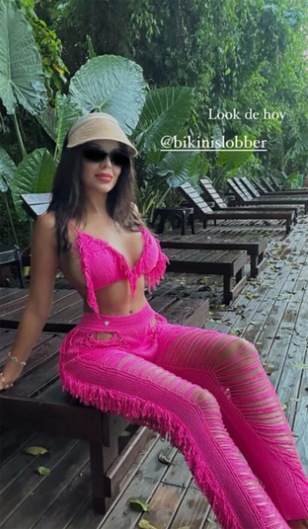 Recientemente, la mediática compartió con sus fanáticos el extravagante look que eligió para pasear por las Cataratas del Iguazú. En un llamativo tono fucsia, posó con la parte superior de una microbikini con flecos y un pantalón de tiro alto con aberturas a juego.