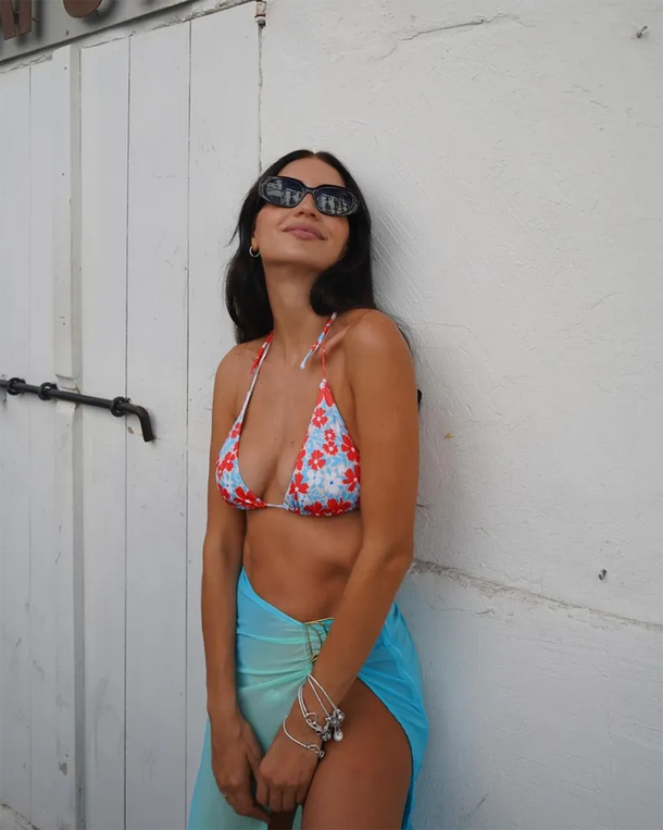 Este verano, Zaira Nara revivió su caminata por Ibiza vistiendo una microbikini con estampado floral, aprovechando que las microbikinis son tendencia este verano. La modelo eligió un diseño en tonalidades de rojo y celeste pastel, que combinó con un elegante pareo de gasa, destacando su gusto por la moda y su habilidad para combinar prendas con estilo.