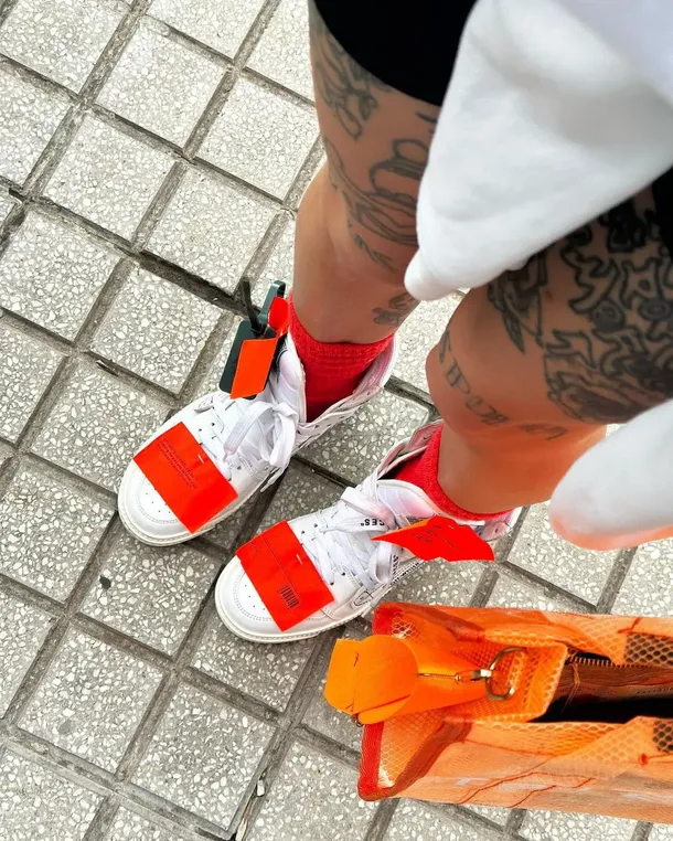 Como dejó ver en la foto que tomó, la artista combinó el calzado con medias naranja shocking, a juego con los detalles de las zapatillas. Además, reafirmó su fanatismo por este color, uno de los que más elige para sus looks, con una cartera al tono de formato rectangular confeccionada en red.