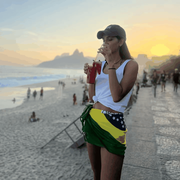 Más cerca a la fecha, desde la playa, la modelo tomó una bandera de Brasil y se la anudó en la cintura, a modo de falda pareo. La combinó con una musculosa blanca lisa anudada y una gorra tipo cap marrón con bordados en el delantero. Para la ocasión, sumó make up 100% al natural: máscara de pestañas negra y algo de gloss en los labios.