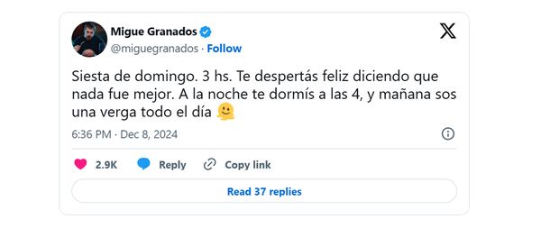 "Siesta de domingo de 3 hs. Te despertás feliz diciendo que nada fue mejor. A la noche te dormís a las 4, y mañana sos una verg... todo el día", comenzó Granados. Luego, con su característico humor ácido, sumó: "Muchos nombres tiraron en programas y en twitter este finde… pero nadie habló del programón que harán Melconian, Trebuq, Lío Pecoraro y Tim Burton en Olga".