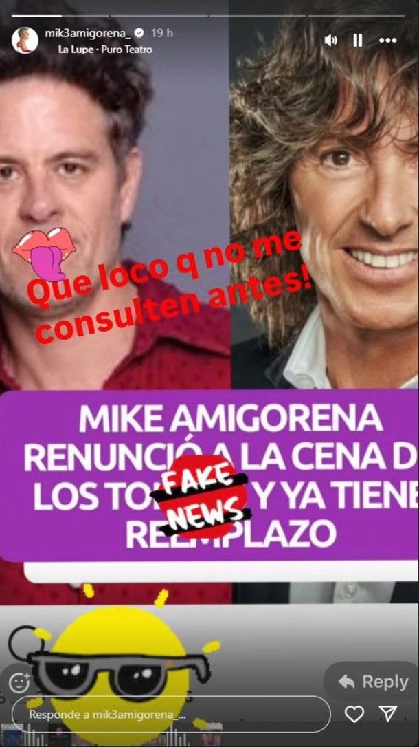"Mike Amigorena renunció a 'La cena de los tontos' y ya tiene reemplazo", se lee en el posteo que compartió el actor, que sería de pocas palabras con sus compañeros de elenco, o quizás todo lo contrario.