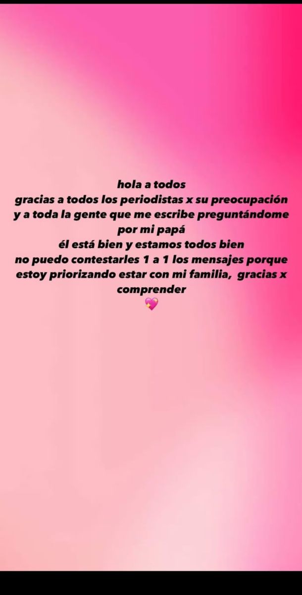 En este sentido, la joven actriz dejó claro cómo se encuentra su padre: “Él está bien y todos estamos bien. No puedo responder a cada uno de los mensajes, ya que estoy priorizando estar con mi familia. Gracias por entender”, cerró.