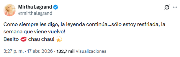 Por ello, la diva no se quedó callada y salió al cruce de las versiones amarillistas: "Como siempre les digo, la leyenda continúa... sólo estoy resfriada, ¡la semana que viene vuelvo! Besito, chau chau", escribió la conductora desde la intimidad de su hogar, acompañando el mensaje con tiernos emojis.