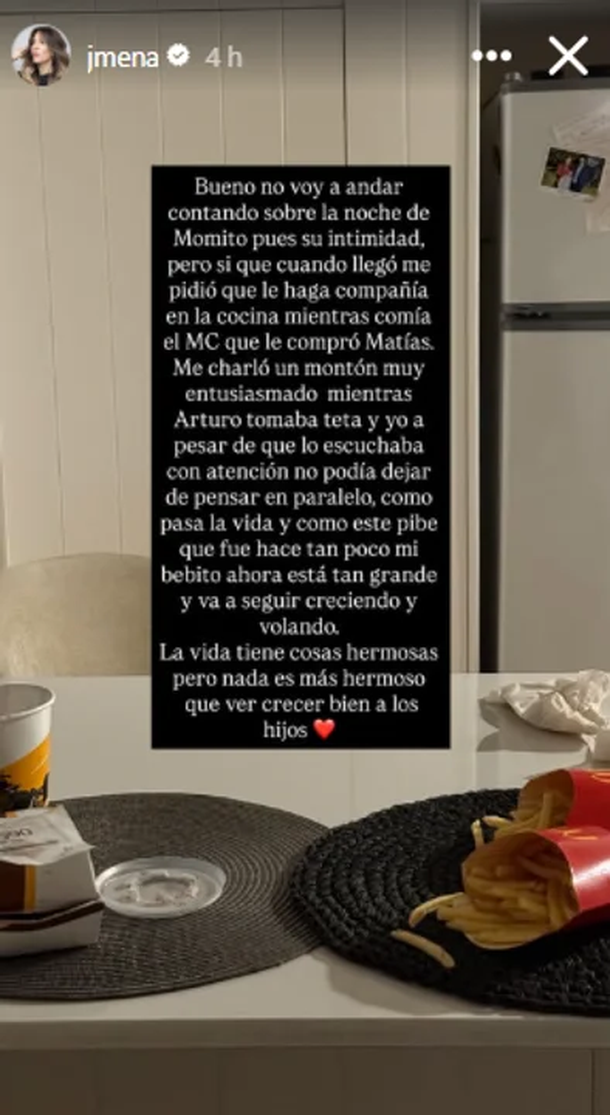 Ya en la mañana, Jimena compartió una reflexión emotiva: “No voy a contar sobre la noche de Momito por su intimidad. Cuando llegó, me pidió que le haga compañía mientras comía el MC que le compró Matías. Me charló un montón, muy entusiasmado mientras Arturo tomaba teta. No podía dejar de pensar en paralelo como pasa la vida y como este pibe que fue mi bebito hace poco, está tan grande y va a seguir creciendo y volando”.