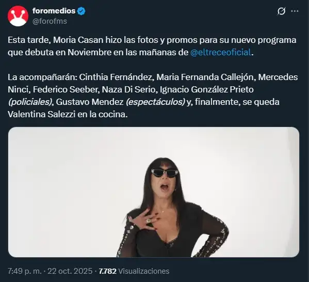 Según confirmó la propia Moria, el ciclo saldrá al aire desde el lunes 10 de noviembre a las 9:00, en reemplazo de Mujeres Argentinas, el programa conducido por María Belén Ludueña. El espacio llevará por nombre “La mañana con Moria”, tal como adelantó Puro Show, y contará con una mesa diversa en la que se cruzarán el espectáculo, la información y la cocina.