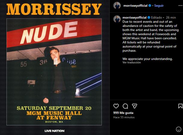 Morrissey comunicó a través de su cuenta oficial de Instagram que sus próximas presentaciones quedan suspendidas, luego de recibir amenazas de muerte que ponían en riesgo su seguridad y la de su equipo.