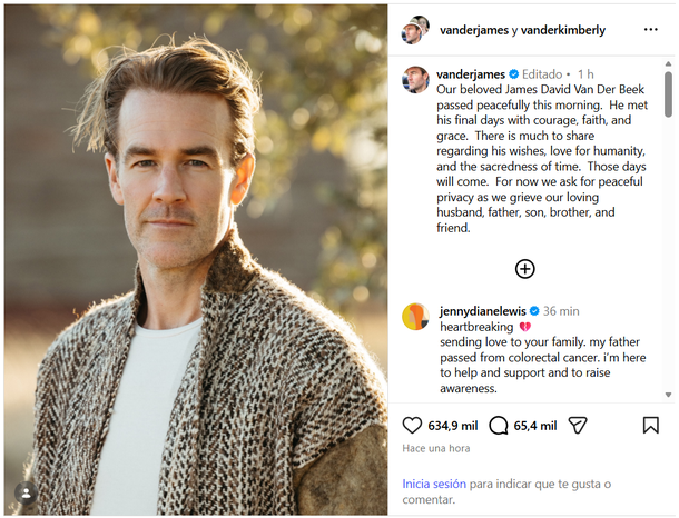 "Nuestro amado James David Van Der Beek murió pacíficamente esta mañana. Encontró su final con valentía, fe y gracia", comenzó indicando. Y añadió: "Hay mucho que compartir con respecto a sus deseos, amor por la humanidad y lo sagrado del tiempo. Esos días vendrán. Por ahora, pedimos privacidad pacífica mientras lamentamos a nuestro amado esposo, padre, hijo, hermano y amigo".