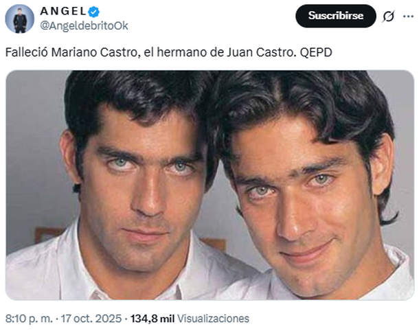 En las últimas horas, trascendió una dura noticia para el ambiente artístico y periodístico: murió Mariano Castro, hermano gemelo de Juan Castro, que se desempeñó como locutor, periodista y también funcionario de Mauricio Macri cuando el expresidente estaba al frente de la Ciudad de Buenos Aires.