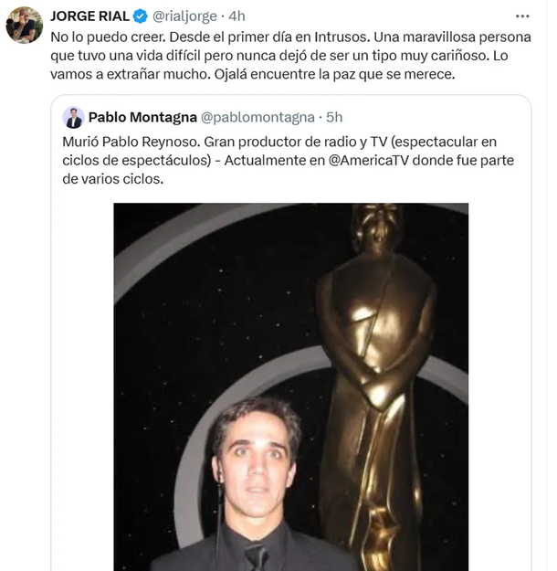“Era parte de este canal, alguien muy querido por todos. Pablo Reynoso, nuestro compañero de Intrusos que lamentablemente hoy va a ser un ‘hasta siempre’ o ‘hasta pronto’, o hasta que alguna vez los astros, o la Tierra, o los dioses, nos vuelvan a cruzar”, agregó el conductor, visiblemente emocionado.