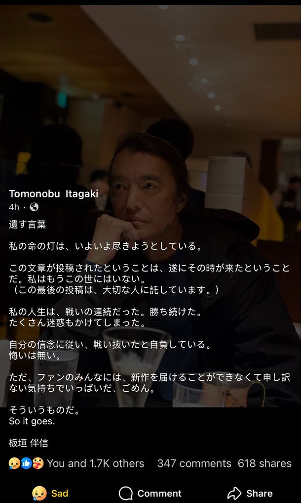 La jornada de este jueves comenzó con un mensaje de despedida en el perfil de Facebook de Itagaki, en el que el creador de videojuegos anunció su propia muerte: "La luz de mi vida finalmente se está apagando. Si este mensaje ha sido publicado, significa que finalmente ha llegado el momento. Ya no estoy en este mundo", escribió.