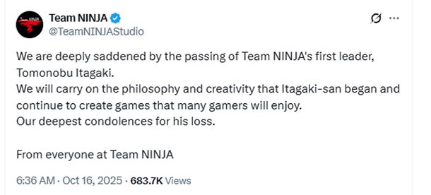 "Estamos profundamente entristecidos por el fallecimiento del primer líder del Equipo NINJA, Tomonobu Itagaki. Continuaremos con la filosofía y la creatividad que Itagaki-san inició y continuaremos creando juegos que muchos jugadores disfrutarán. Nuestro más sentido pésame por su pérdida", escribió el Team Ninja.