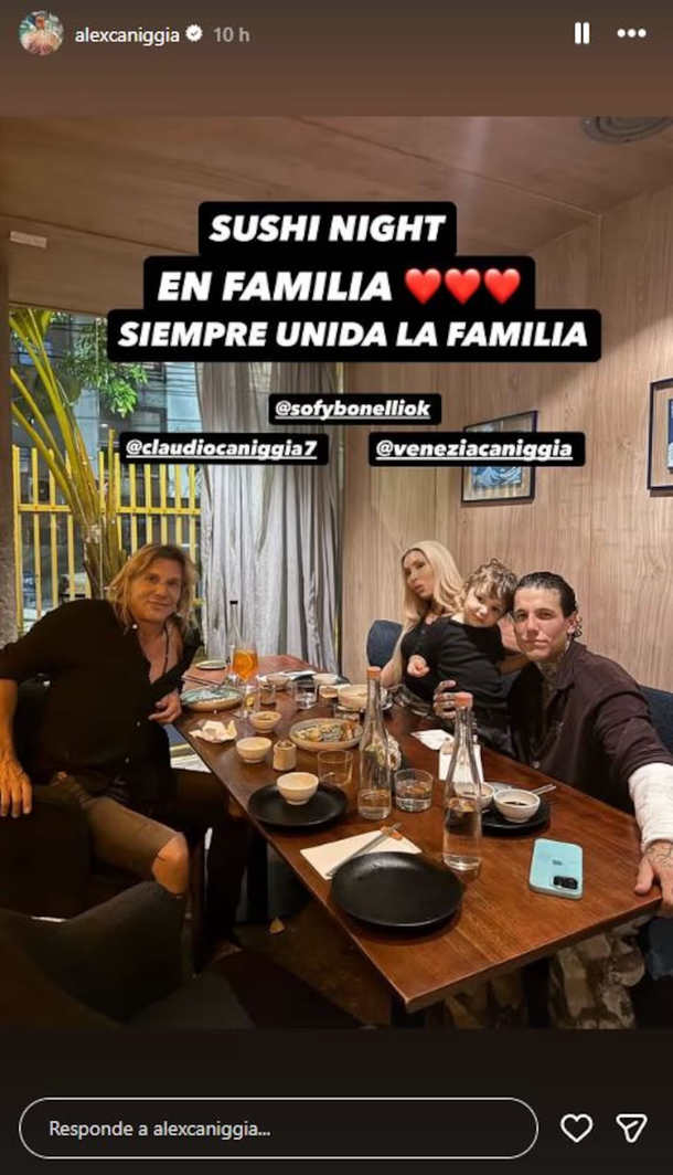 Alex Caniggia volvió a encender la polémica dentro de su familia con una publicación que rápidamente se volvió tema de conversación en redes sociales. El mediático compartió una foto de una cena junto a su padre, Claudio Paul Caniggia; su hija, Venezia; y la actual pareja del exfutbolista, Sofía Bonelli.