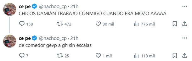 Atónito por verlo entrar a la casa, Nacho habló en su cuenta de X y reveló:"Chicos Damián trabajó conmigo cuando era mozo". Luego de esto, en otro tweet contó dónde fueron compañeros de trabajo: se trata de el Club de Gimnasia y Esgrima de Villa del Parque. Es por eso que, mediante su perfil oficial, el influencer quiso hacer una broma.