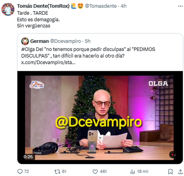 En este sentido y tras la viralización del pedido de disculpas de Olga, el conductor de Net TV volvió a atacar a los miembros del streaming: "Tarde. TARDE. Esto es demagogia. Sinvergüenzas", lanzó en su cuenta de la red social X, señalando la contradicción existente entre la primera reacción del dueño de Olga y la rectificación posterior.
