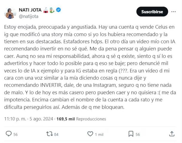 En las últimas horas Nati Jota recibió una noticia que no le agradó en lo absoluto. A través de sus redes sociales fue notificada por sus seguidores que su imagen estaba siendo utilizada para vender celulares de alta gama. Por eso, mostró su indignación en redes sociales y alertó al resto de sus fanáticos sobre esta situación.