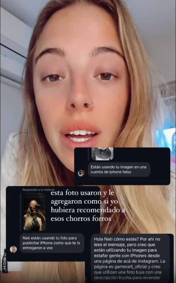 "Estén atentos, son estafadores", comenzó diciendo. Luego, explicó que hay una cuenta de Instagram que vende celulares con la siguiente táctica: editar una foto que ella había subido para sumarla a un texto que parecía una recomendación. "Como si yo les hubiera comprado a ellos mi iPhone", expresó visiblemente molesta por la situación.