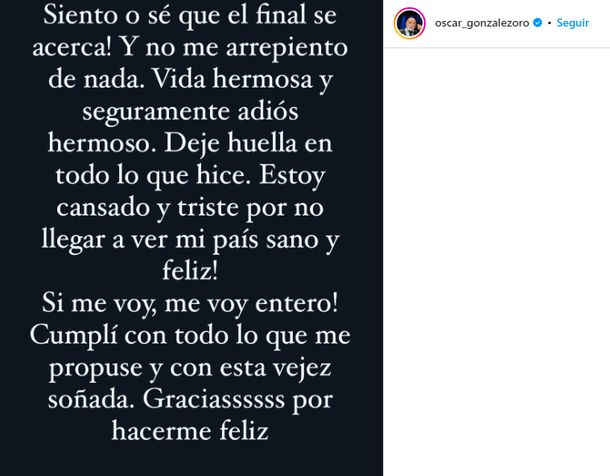 “Siento o sé que el final se acerca. Y no me arrepiento de nada. Vida hermosa y seguramente adiós hermoso. Dejé huella en todo lo que hice. Estoy cansado y triste por no llegar a ver a mi país sano y feliz. Si me voy, me voy entero. Cumplí con todo lo que me propuse y con esta vejez soñada. Gracias por hacerme feliz”, redactó el periodista.